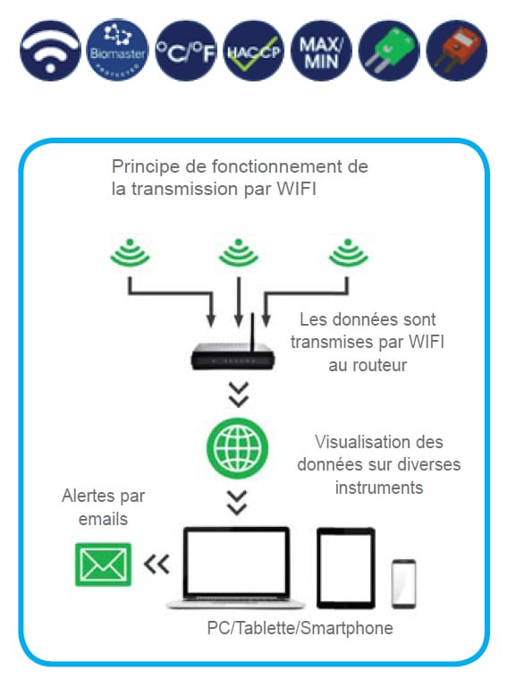 ThermaWIFI Data mesure et enregistre simultanémant la température et l’humidité relative (%HR). il vous permet de paramétrer des alertes et d’être informé immédiatement sur votre ordinateur ou votre smartphone.