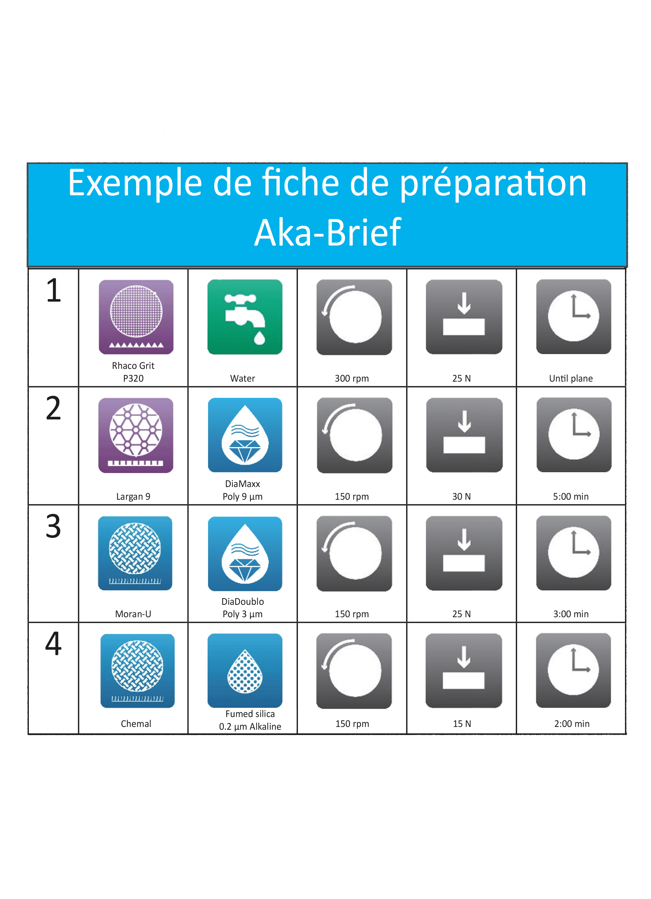 Le guide d’utilisation Aka-Brief est une plaquette décrivant la préparation étape par étape, avec des vues de la micrographie avec le résultat de préparation attendu après chaque étape de polissage.