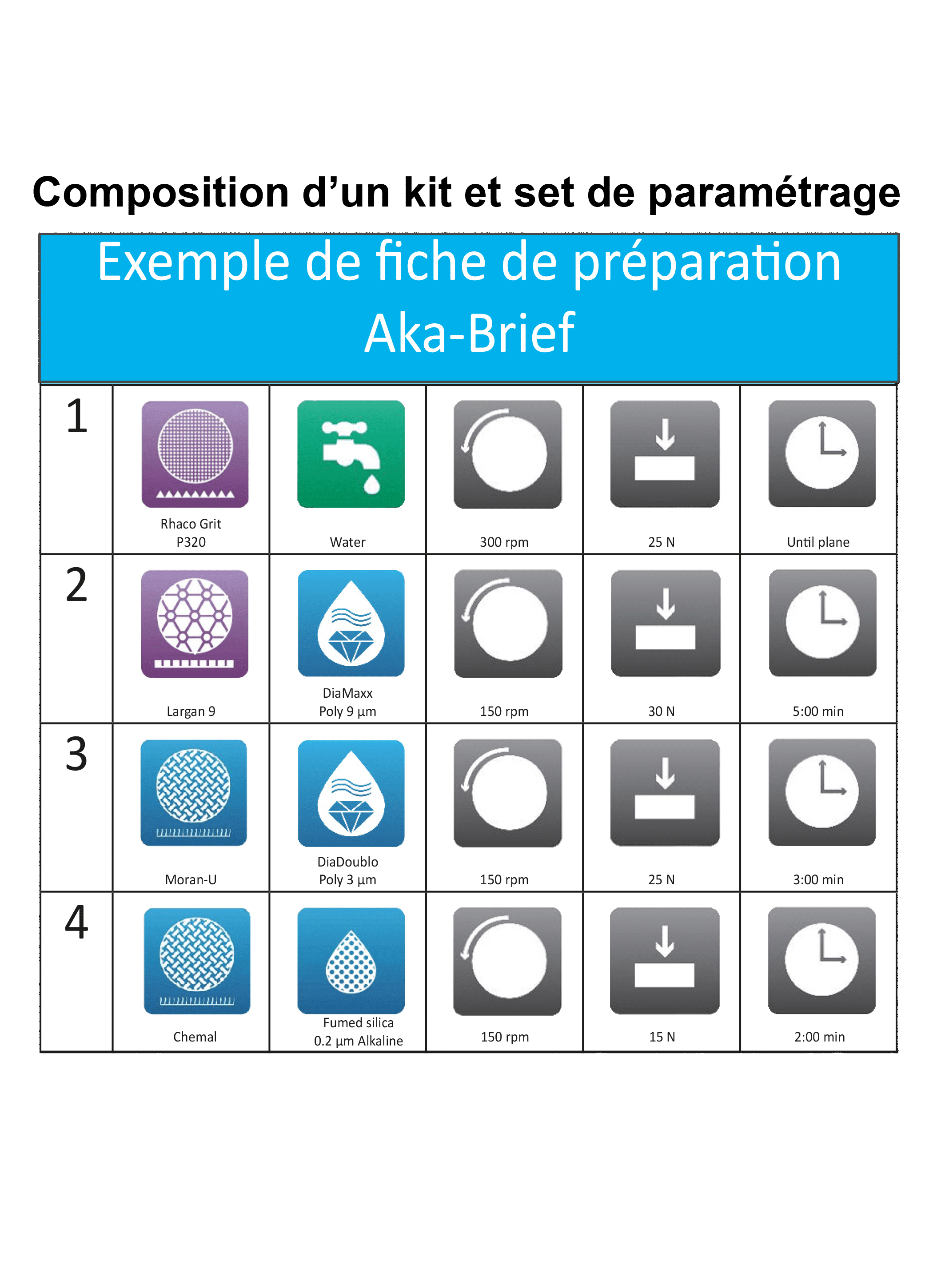 Le guide d’utilisation Aka-Brief est une plaquette décrivant la préparation étape par étape, avec des vues de la micrographie avec le résultat de préparation attendu après chaque étape de polissage.